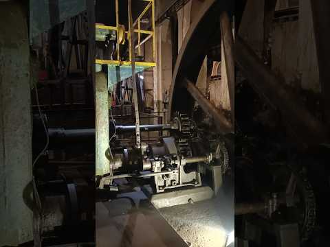 - Wielkie koło zamachowe: W tle po lewej widać potężne koło. Jego zadaniem było gromadzenie energii kinetycznej, aby maszyna mogła utrzymać płynność pracy i pokonać opór materiału podczas "brania" blachy przez walce.